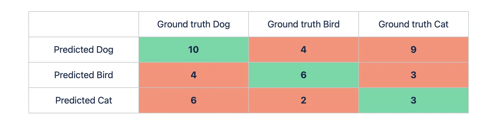 - Micro Precision score: (TP Dog + TP Bird + TP Cat) / ((TP + FP) Dog + (TP + FP) Bird + (TP + FP) Cat) = (10 + 6 + 3) / ((4 + 9 + 10) + (4 + 3 + 6) + (6 + 2 + 3)) ~ 0.4