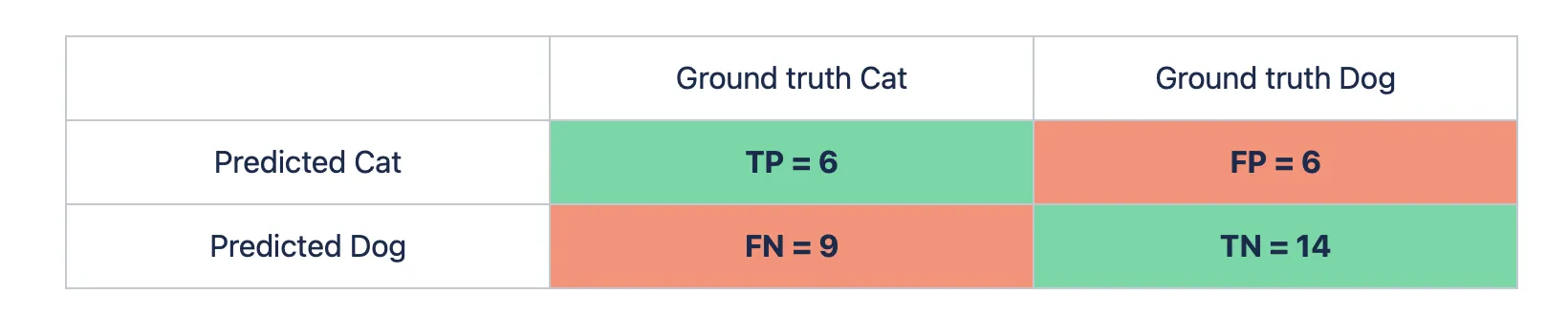 Let’s say we have a binary Classification task. For example, you are trying to determine whether a cat or a dog is on an image. You have a model and want to evaluate its performance using Prrecision. You pass 15 pictures with a cat and 20 images with a dog to the model. From the given 15 cat images, the algorithm predicts 9 pictures as the dog ones, and from the 20 dog images - 6 pictures as the cat ones. Let’s build a Confusion matrix first (you can check the detailed calculation on the Confusion matrix page).