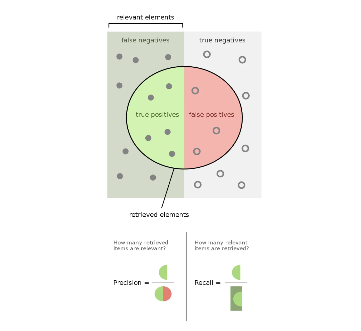 - Precision = (TP) / (TP + FP) = (6) / (6 + 6) ~ 0.5