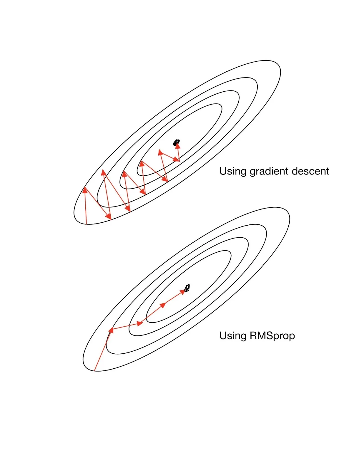 We can see that higher gradient in the vertical direction and the lower in the horizontal direction is slowing down the overall search process of the optimal solution. The use of RMSprop solves this problem by finding a better search “trajectory”.