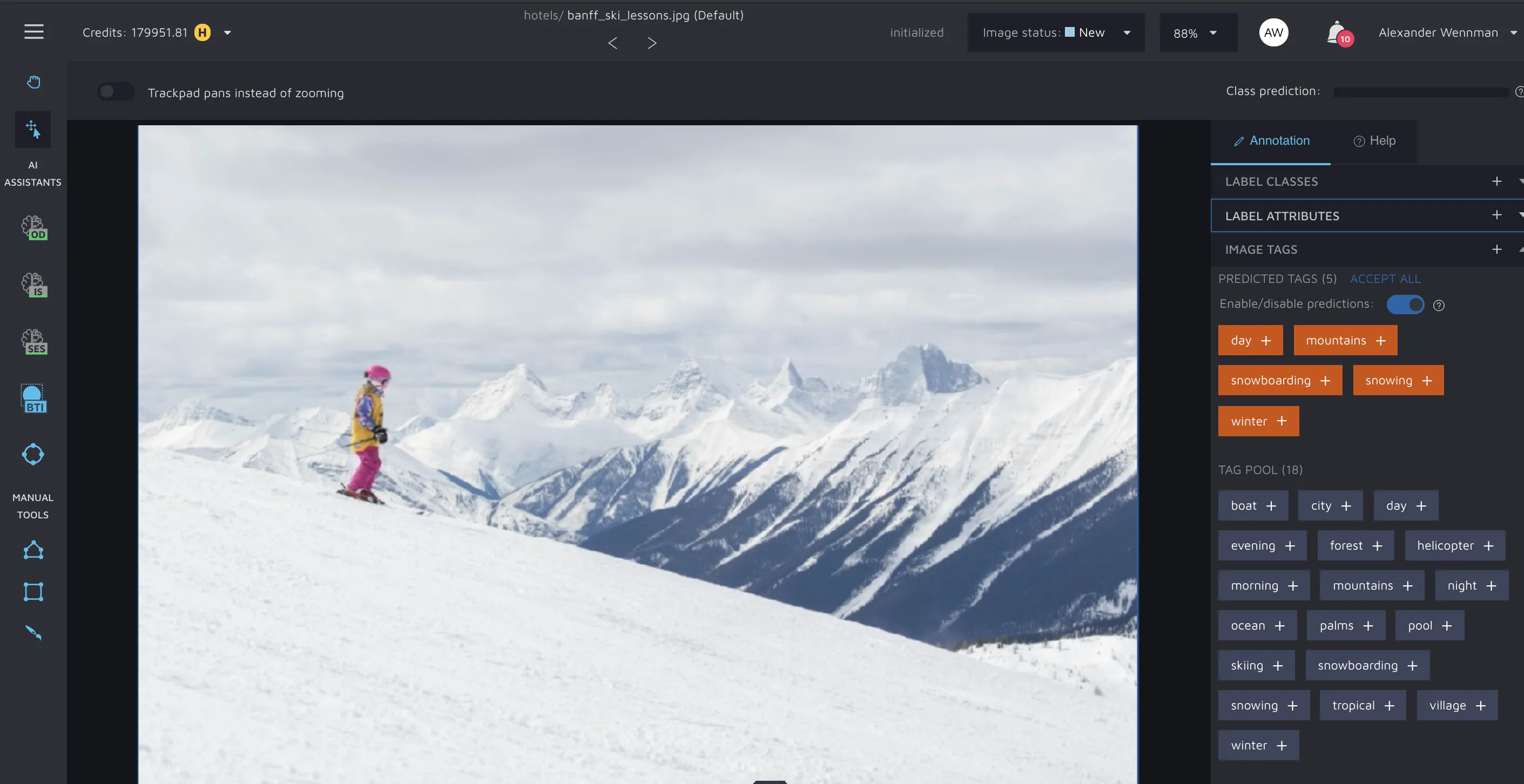 To see the predictions you should turn on the Assistant and then select an image from the bottom bar of the Annotation Environment UI. As soon as you do it, we will populate the attribute input(s) with suggestions - as we do here.