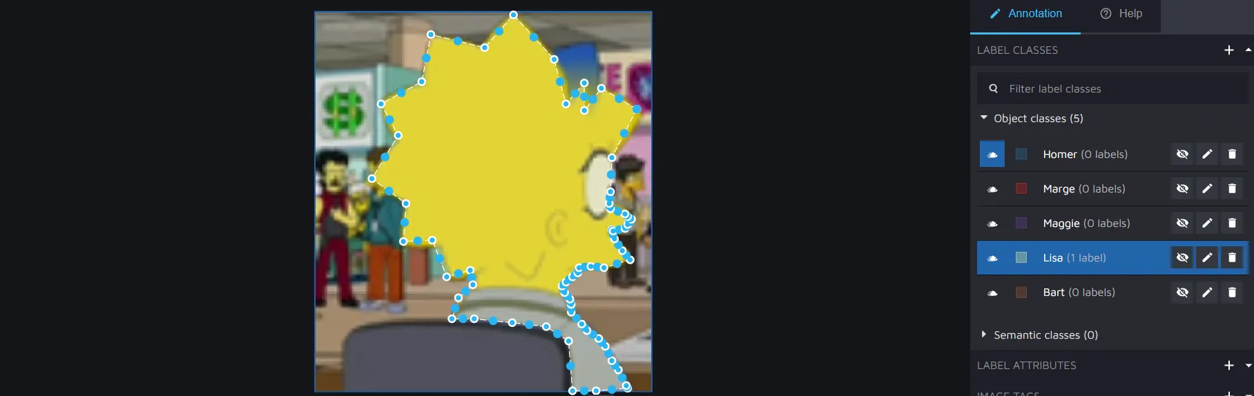 Second, you must create the label classes and attributes you will use in your project. Simply follow the guide from the documentation, and it will take you seconds to do. In our case, we have 404 images of Simpsons characters. The classes are the characters themselves - Homer, Marge, Maggie, Lisa, and Bart.