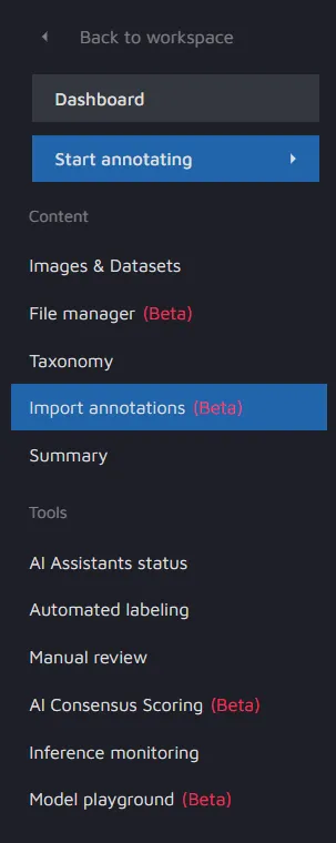 Go to the project dashboard and click on the Import annotations (Beta) button.