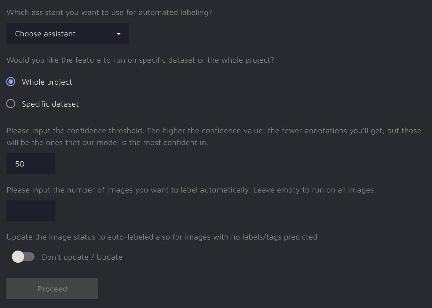 - Don't update / Update toggle: this flag determines the feature's behavior if Automated labeling did not predict a single label or tag for an image: