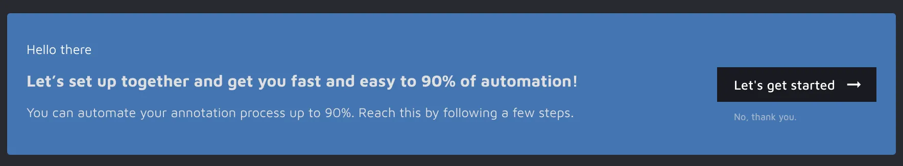 If you are familiar with Hasty, you can easily remove it by clicking on the "No, thank you" phrase. Otherwise, we suggest clicking on the "Let's get started" button to learn more about Hasty and its capabilities and get a step-by-step guide on how to squeeze every last drop of automation out of the tools we have built.