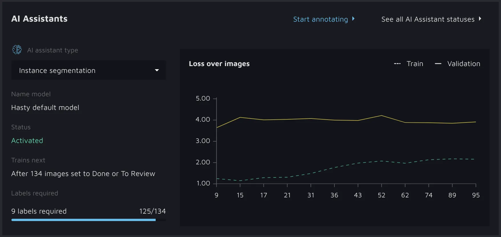 • The Trains next section tells you how many new annotations or images you need to annotate to train a new model (differs depending on model);