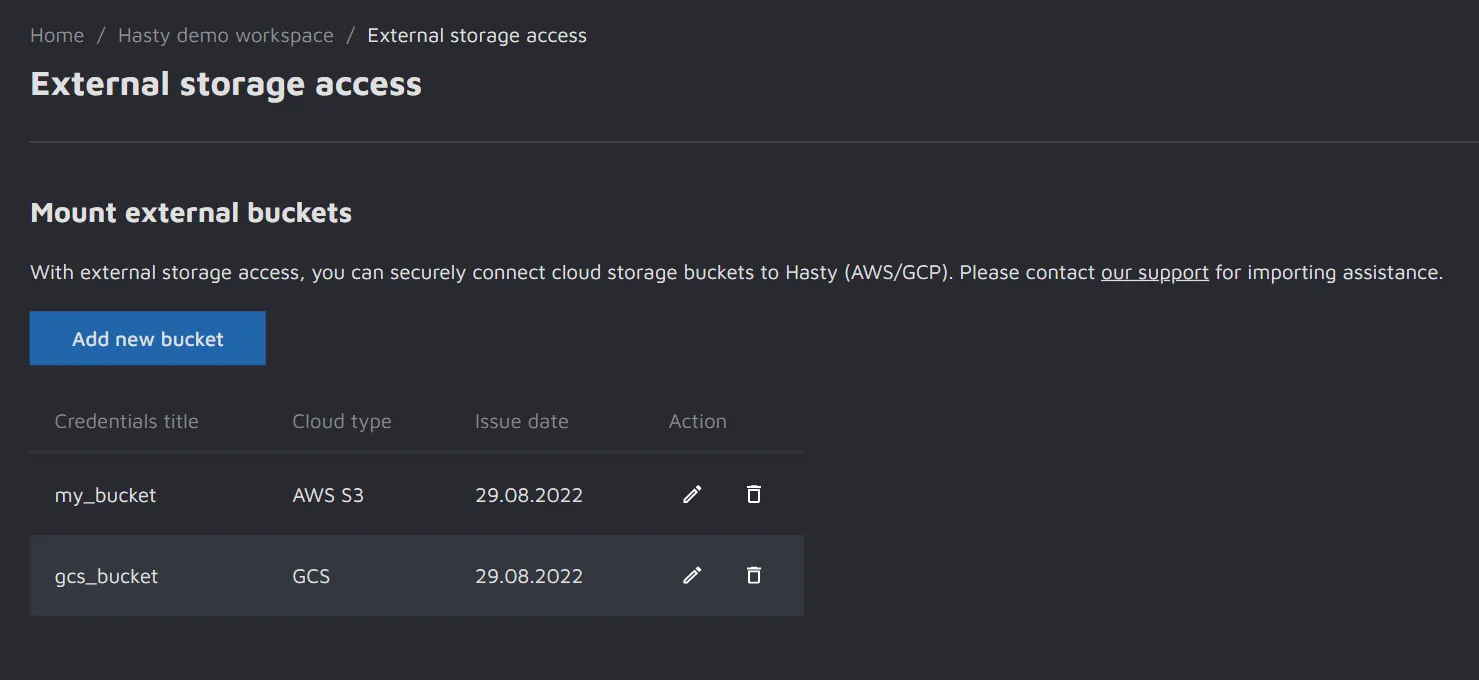 Currently, Hasty supports Google Cloud Storage (GCS) and Amazon Web Services S3 (AWS S3) external storages. We also have support for Microsoft Azure in closed beta. Contact us if you want to try it yourself.