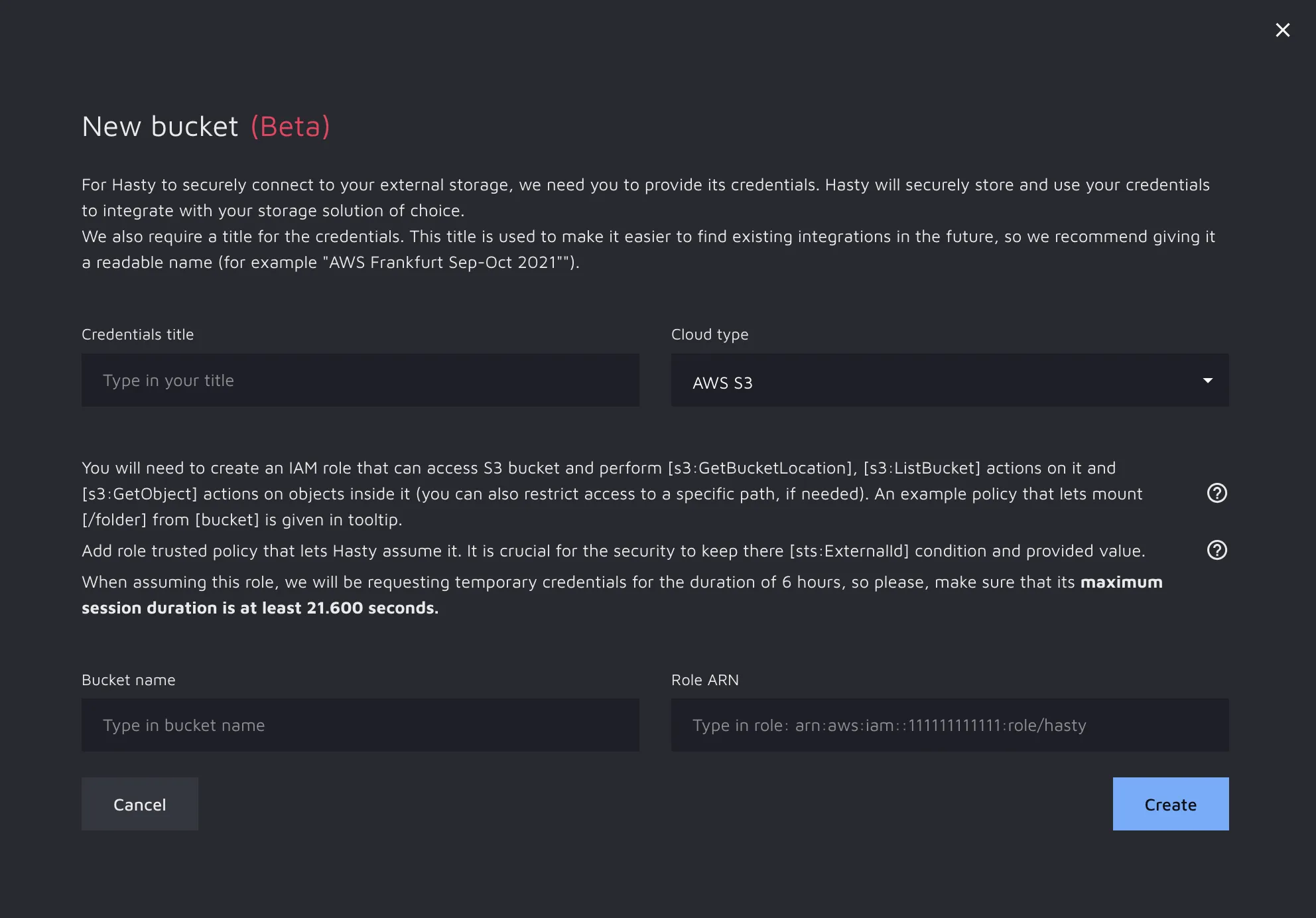 When assuming the role, Hasty will be requesting temporary credentials for the duration of 6 hours, so please make sure that its maximum session duration is at least 21.600 seconds.