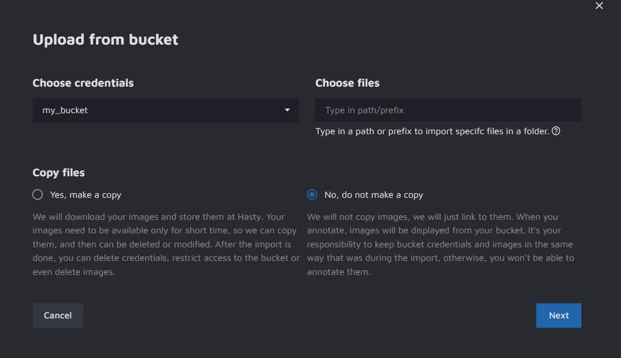 • If you choose to make a copy, Hasty will get access to your images for a short time to fetch them for your project. After the images are copied, you can delete credentials, restrict access to your bucket, or even delete the images. The manipulations with the images in your external storage will not affect your Hasty annotation process since their copies will be already imported.