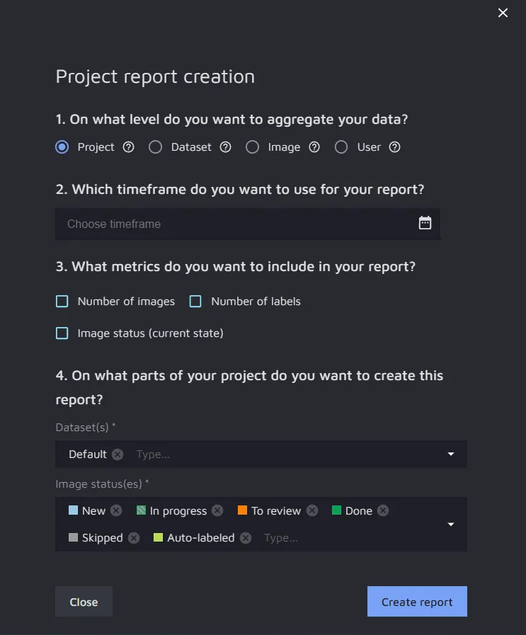 • Image level – get data on each image (suits if you want to review the project in detail);
