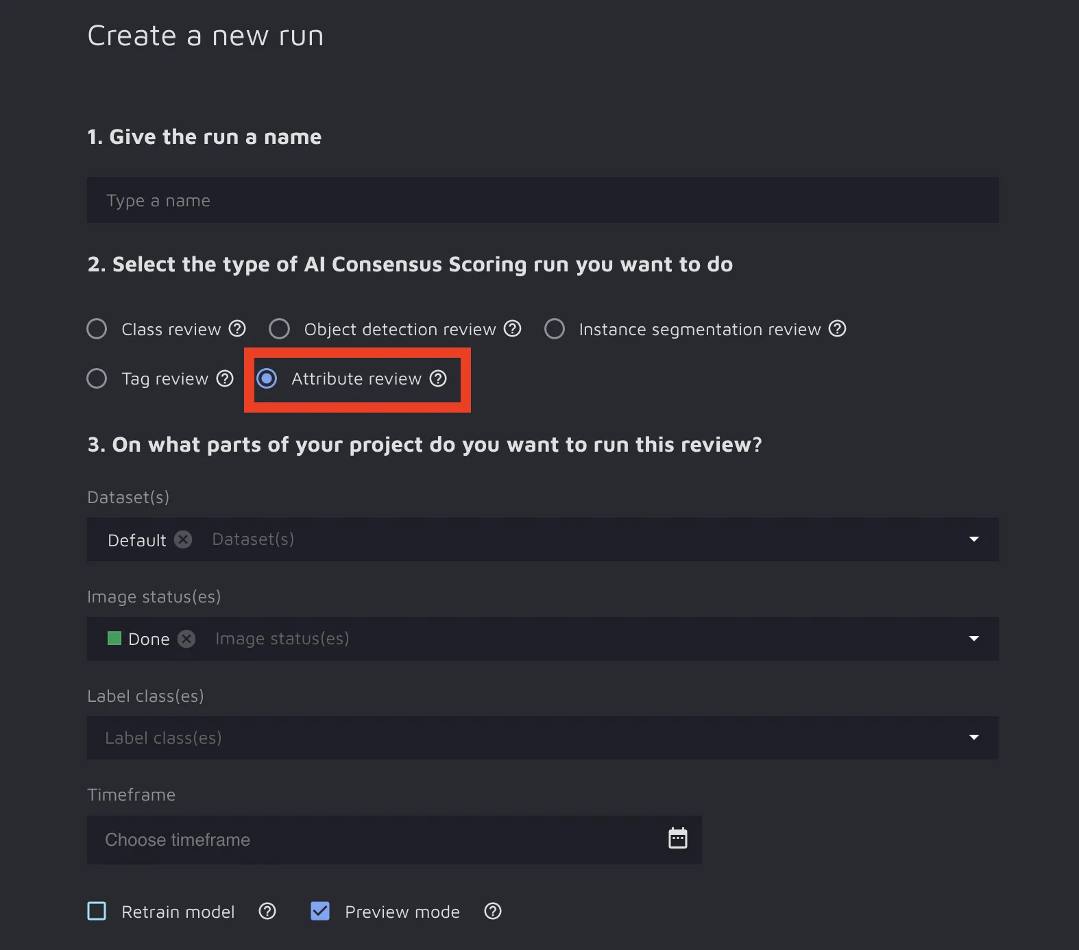 4. Click on the “Create new run button“ and choose “Attribute review” as the run type.
