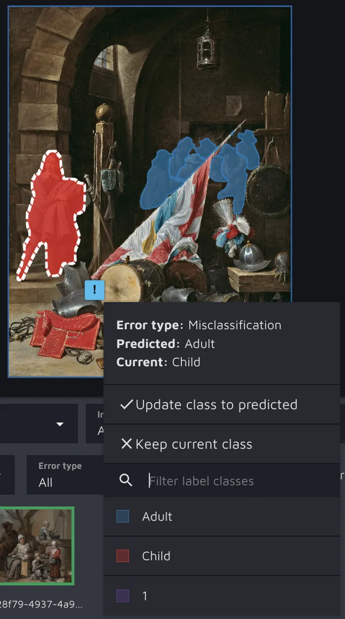 Now that you know how to access AI CS results in AE, it is time to see how to work with them. Please select an image from the bottom bar and check AI CS suggestions directly. A dotted line will circle each suggestion, and an exclamation mark will be near it.