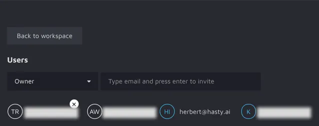 To invite a user, first select a role that you want the user to have (here it is "Owner"). Then, write the email of the person you want to invite in the input field to the right. Press "Enter" and an invite will be sent.